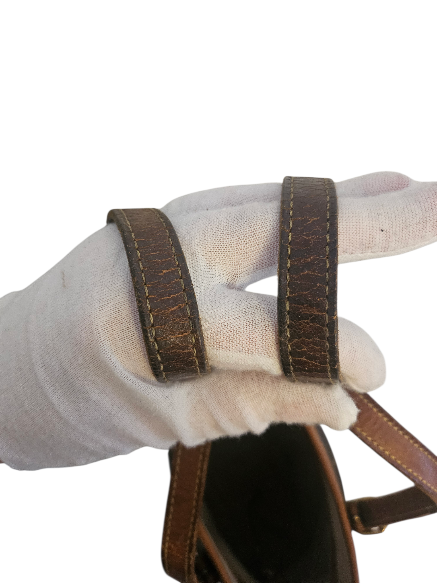 Käytönjälkiä: Värjäytymiä metalliosissa. Nahka on tummunut, kuivunut ja halkeillut (erityisesti kahvoissa). Käytönjälkiä pohjassa. Laukun sisämateriaali ja päällä oleva nahkahihna on vaihdettu suutarilla. Olkahihnat ovat korjattu suutarilla.