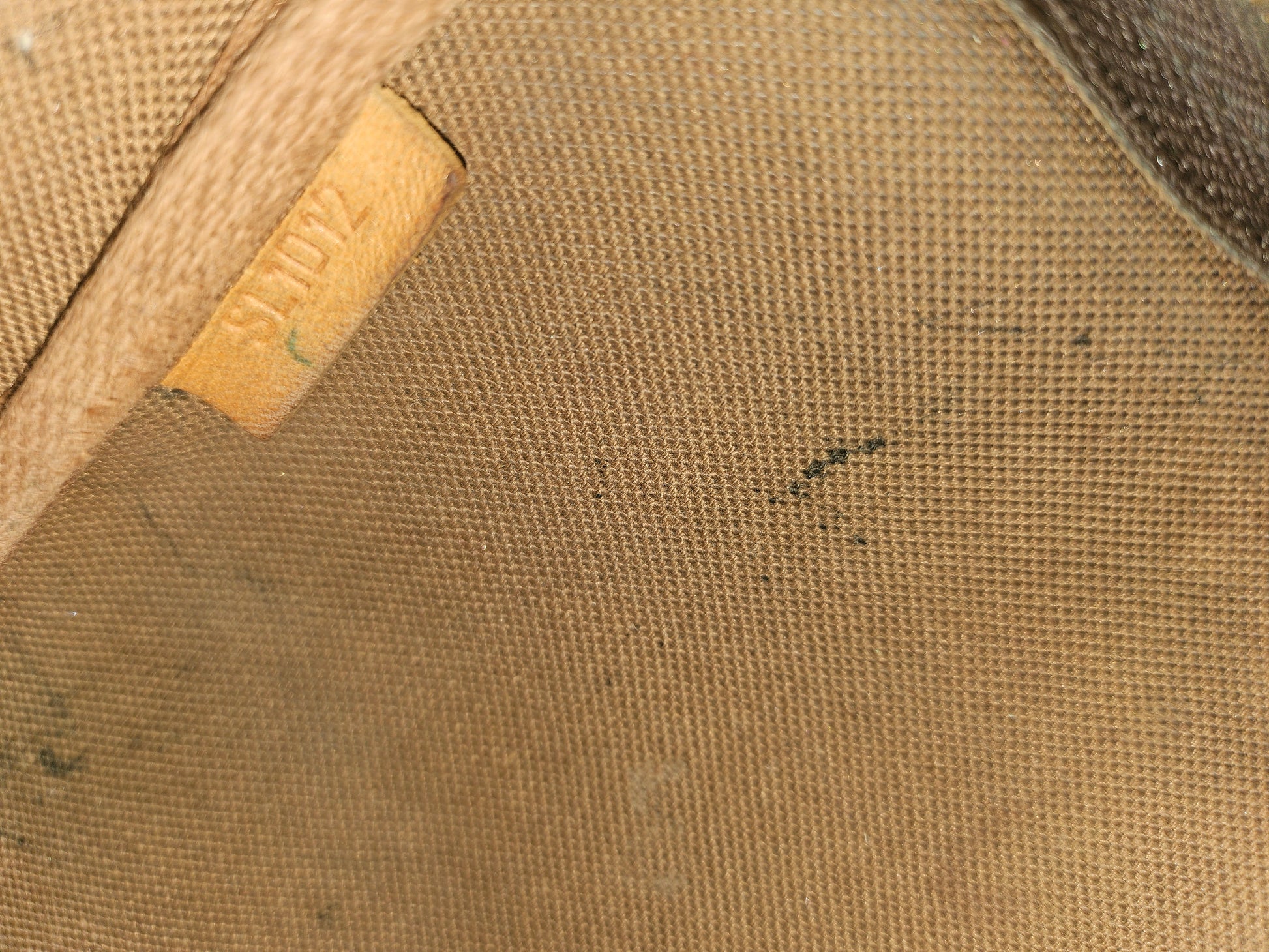 Käytönjälkiä: Värinmuutoksia ja käytönjälkiä metalliosissa. Käytönjälkiä sisällä (kosmetiikka). Nahkaosat ovat tummuneet (rannehihna) ja niissä näkyy käytönjälkiä. Vähäisiä kulumisen jälkiä canvaksessa D-renkaan vieressä.