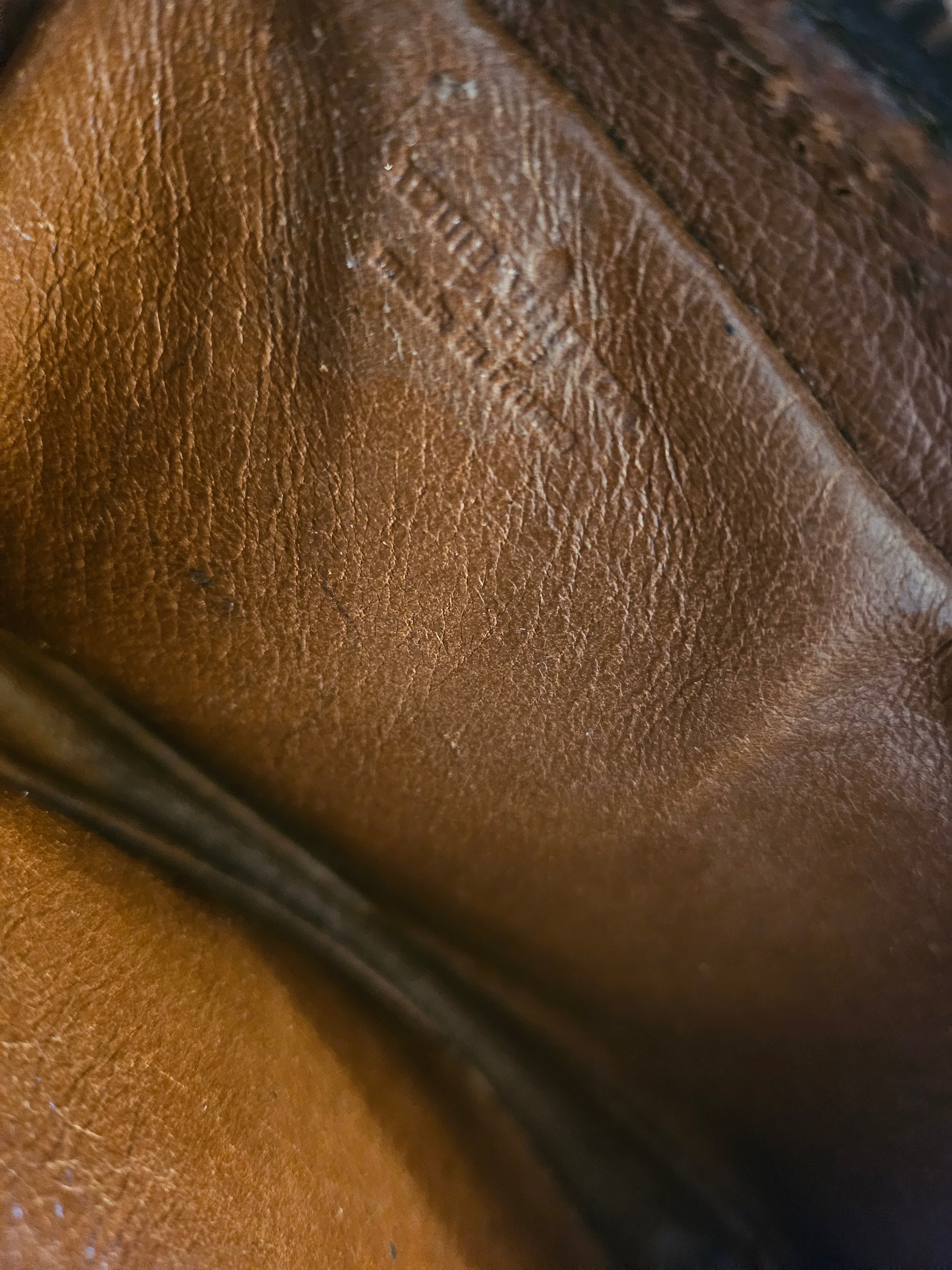 Käytönjälkiä: Värjäytymiä metalliosissa. Käytönjälkiä sisäpuolella. Vetoketju on vaihdettu suutarilla. Silmuruuvi asennettu sivuun. Käytönjälkiä nahkaosissa (erityisesti pohjassa)