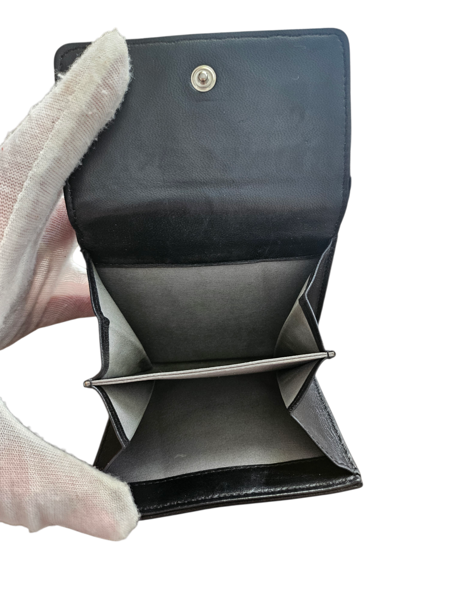 This wallet is made from super soft lambskin and featured by silver toned hardware. Handy size, separate departments for cash, cards and coins. Two button closures, both buttons work properly. Leather conditioner applied.