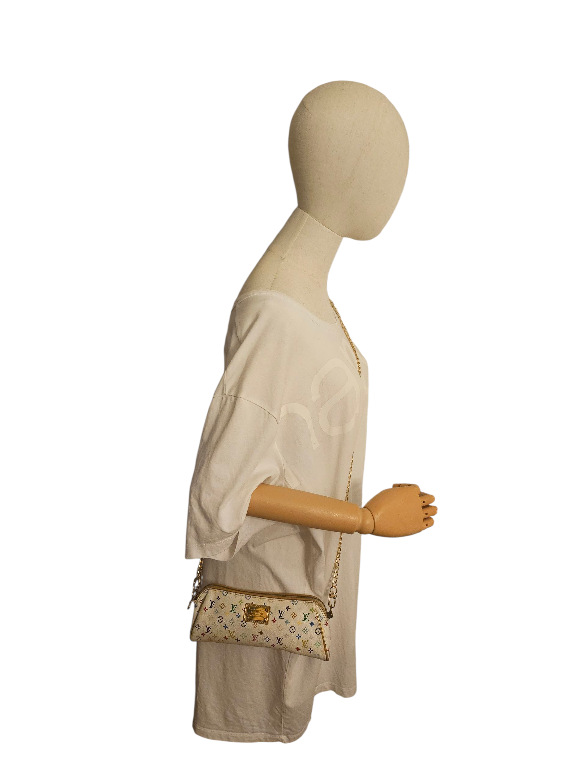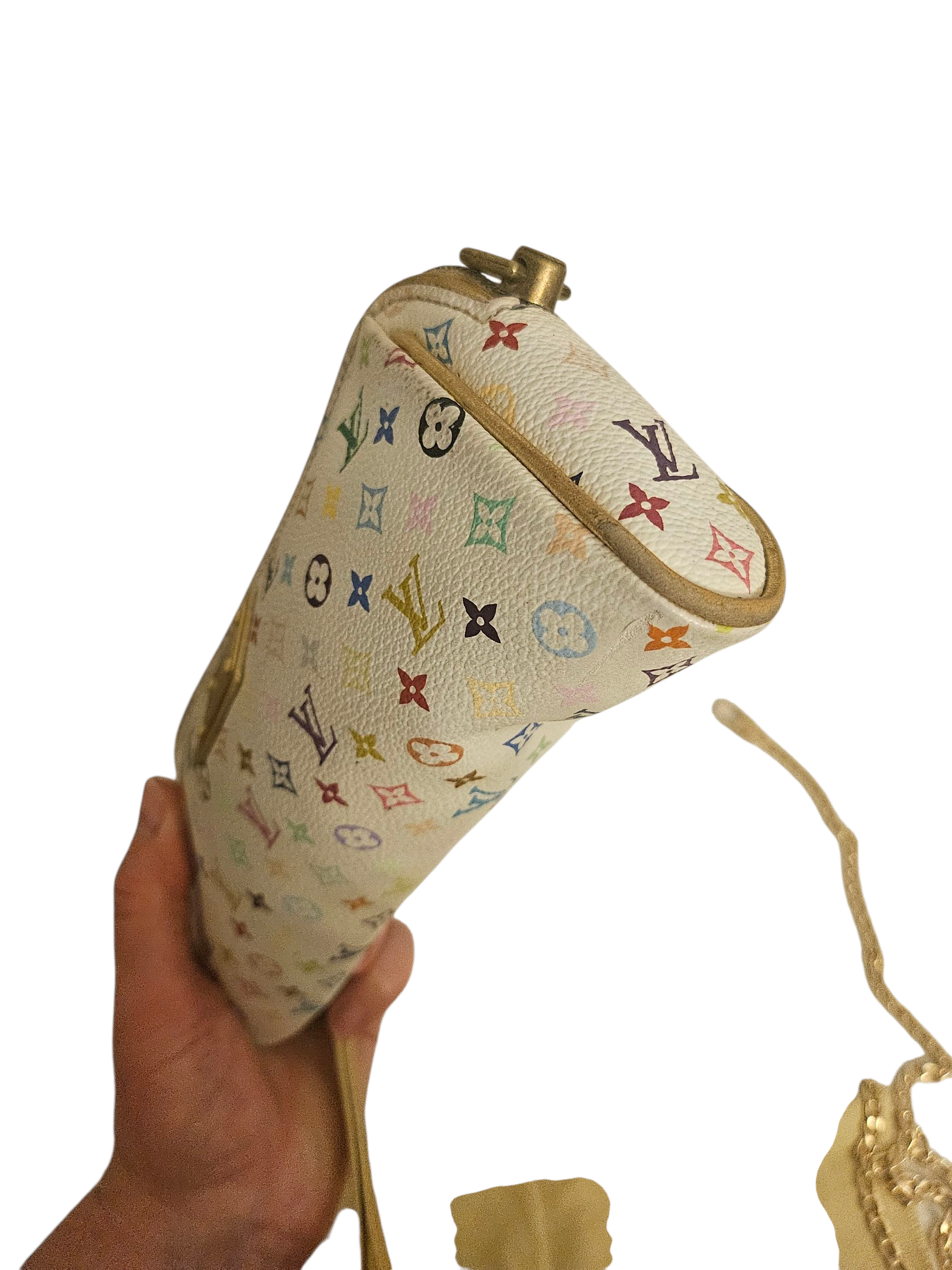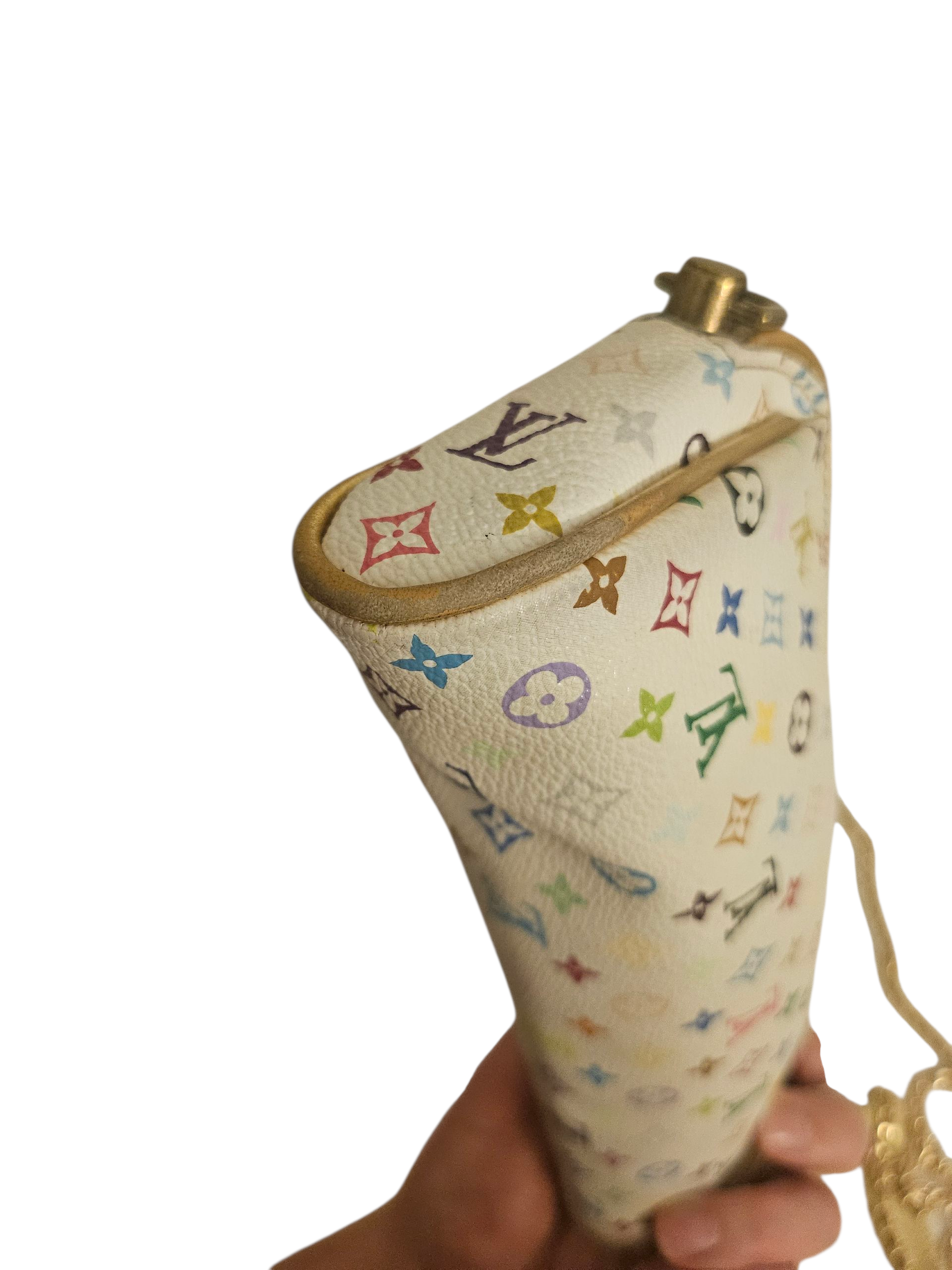 Similar size/shape to a popular Eva bag. Limited edition from 2000s, collaboration of Louis Vuitton and Takashi Murakami. Made from Multicolor Monogram canvas. Turned into bag by installing a bolt on side (without making an extra holes). Now there is an option to attach a different straps and use it as a shoulder bag/crossbody. Original wrist strap is included as well.