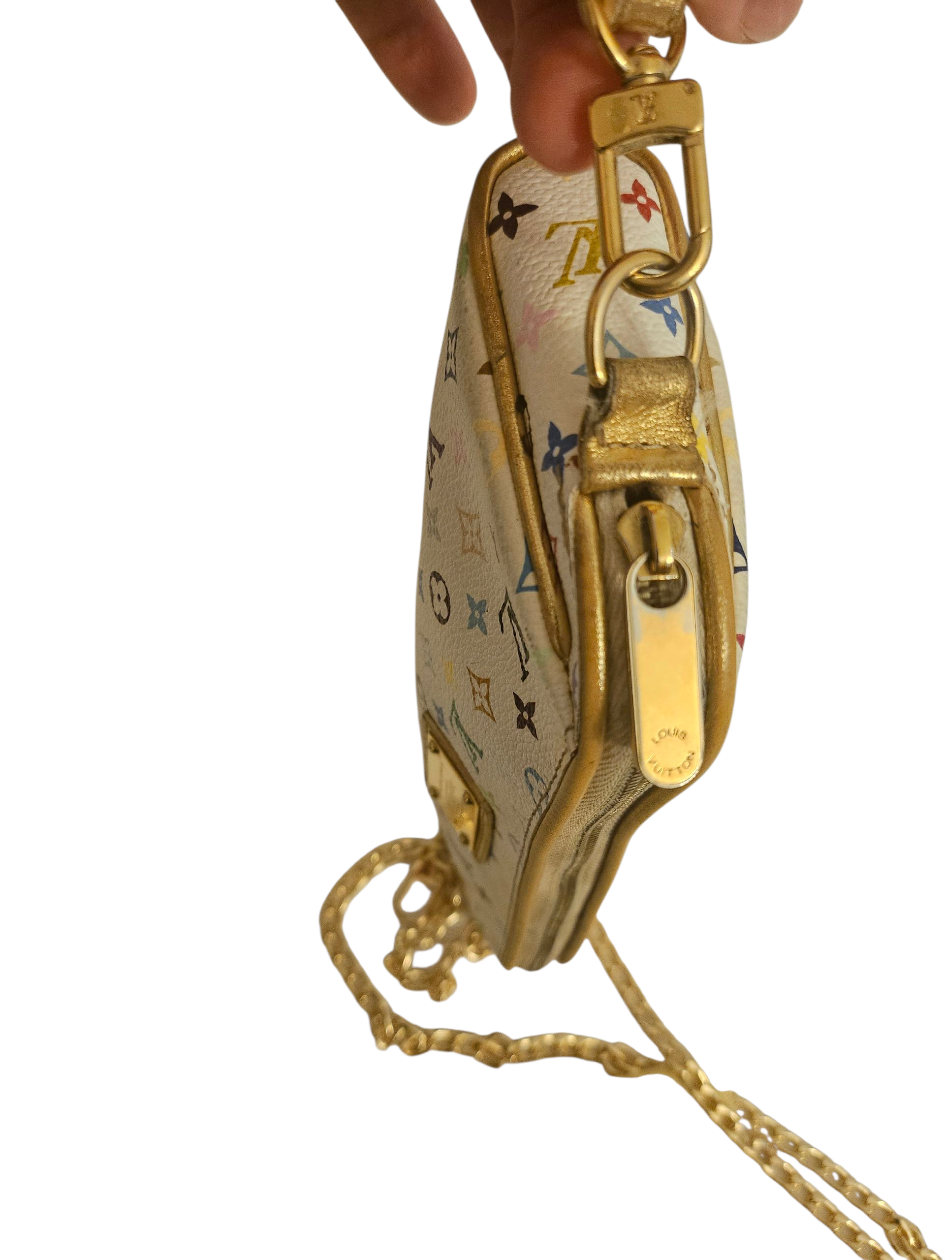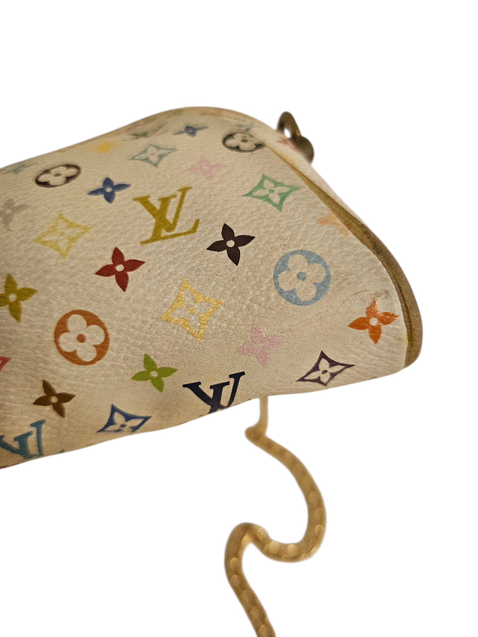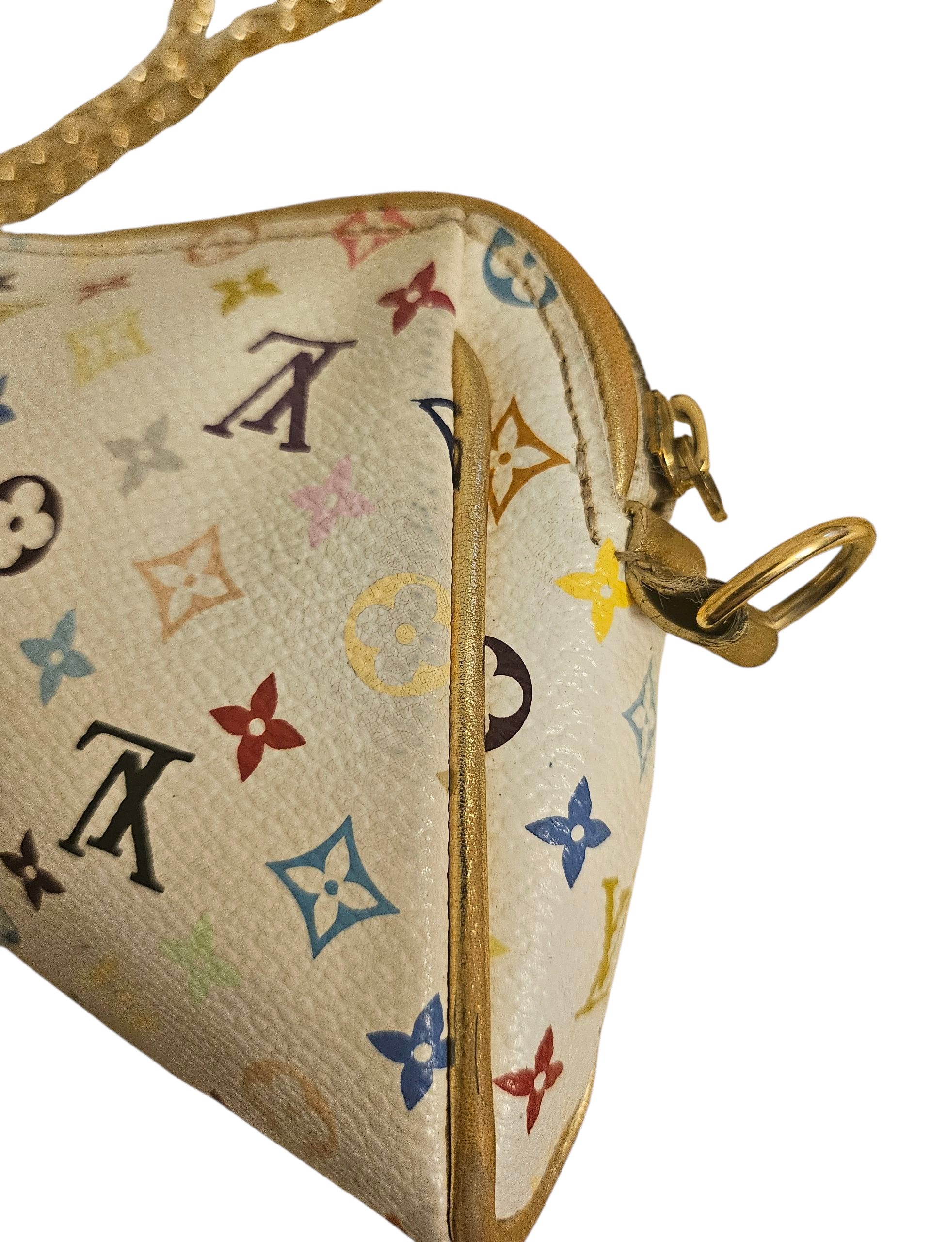 Similar size/shape to a popular Eva bag. Limited edition from 2000s, collaboration of Louis Vuitton and Takashi Murakami. Made from Multicolor Monogram canvas. Turned into bag by installing a bolt on side (without making an extra holes). Now there is an option to attach a different straps and use it as a shoulder bag/crossbody. Original wrist strap is included as well.