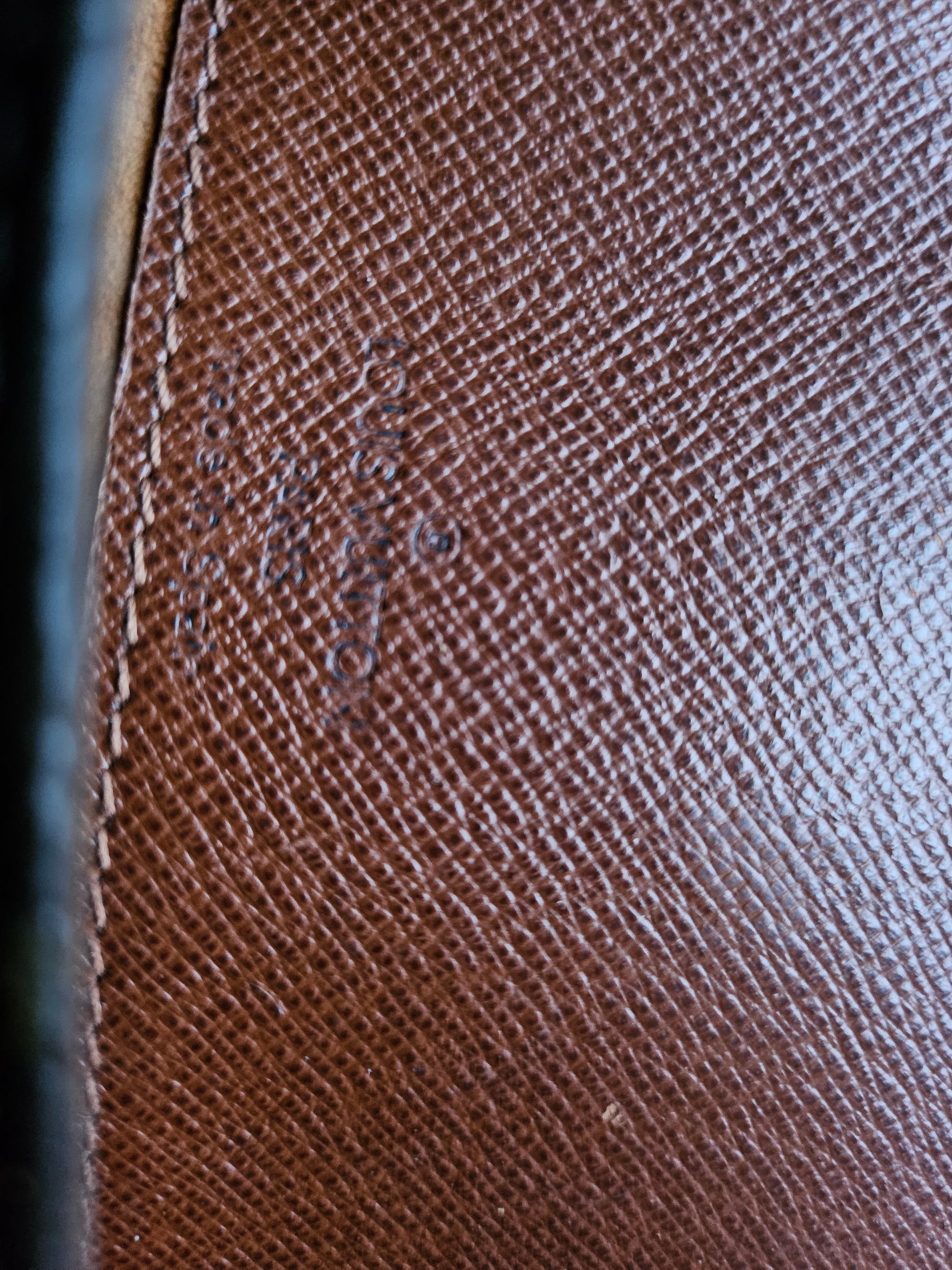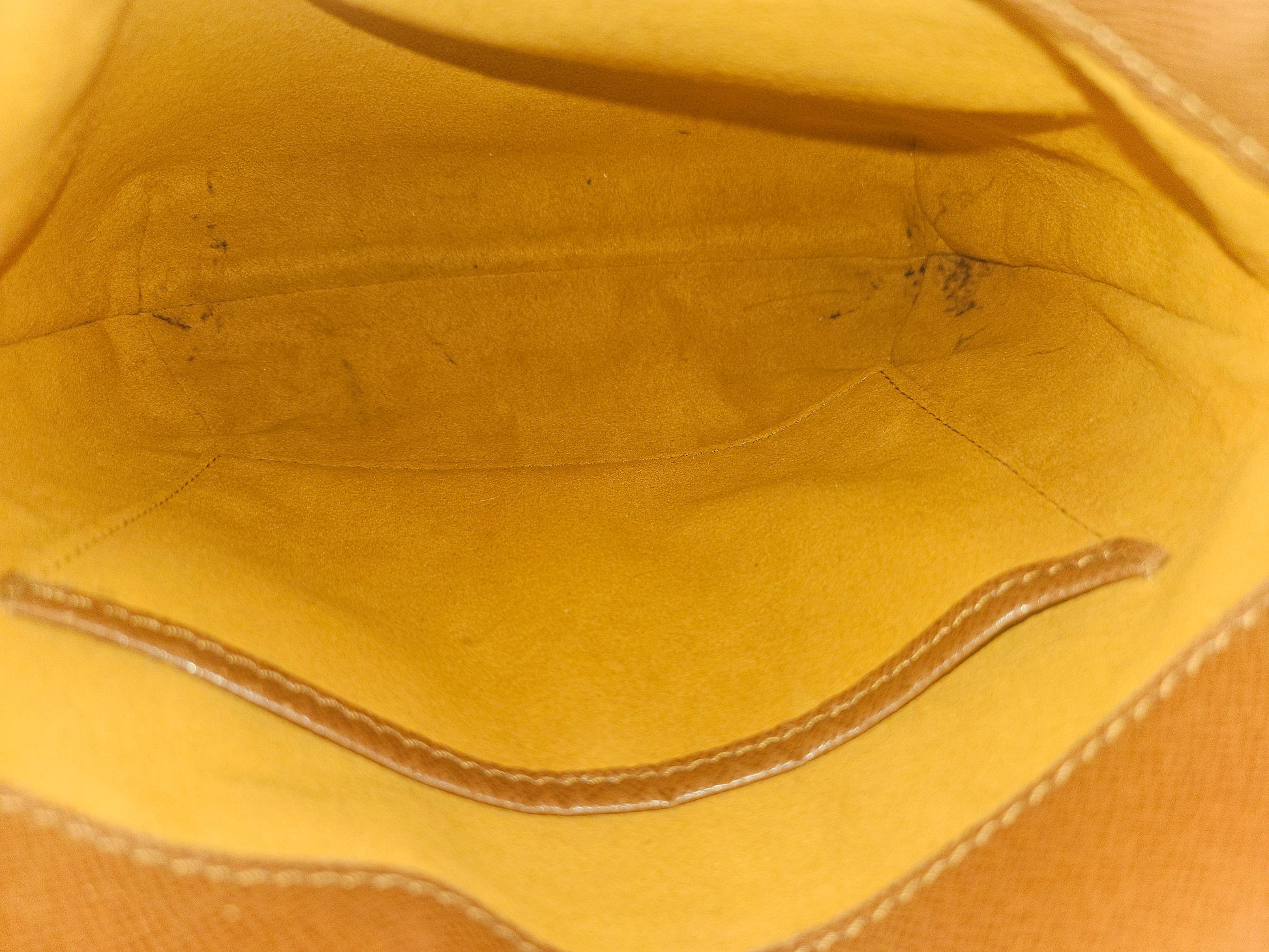 Signs of use: Few under 1 cm cracks inside under the lid (not seen in use). Minor discoloration on metal parts. Pen marks inside. Signs of usage on leather parts, leather around the bag has darkened.