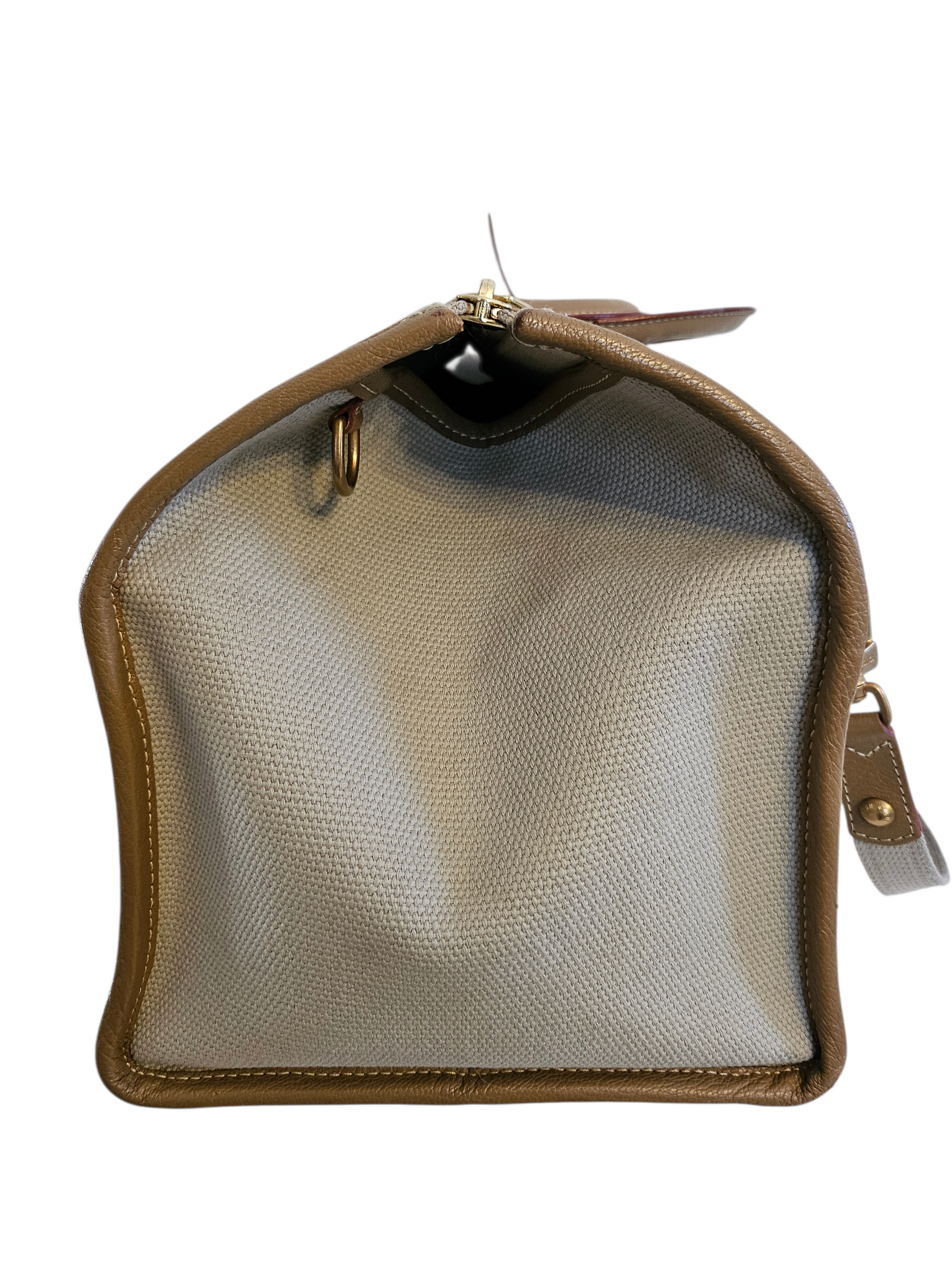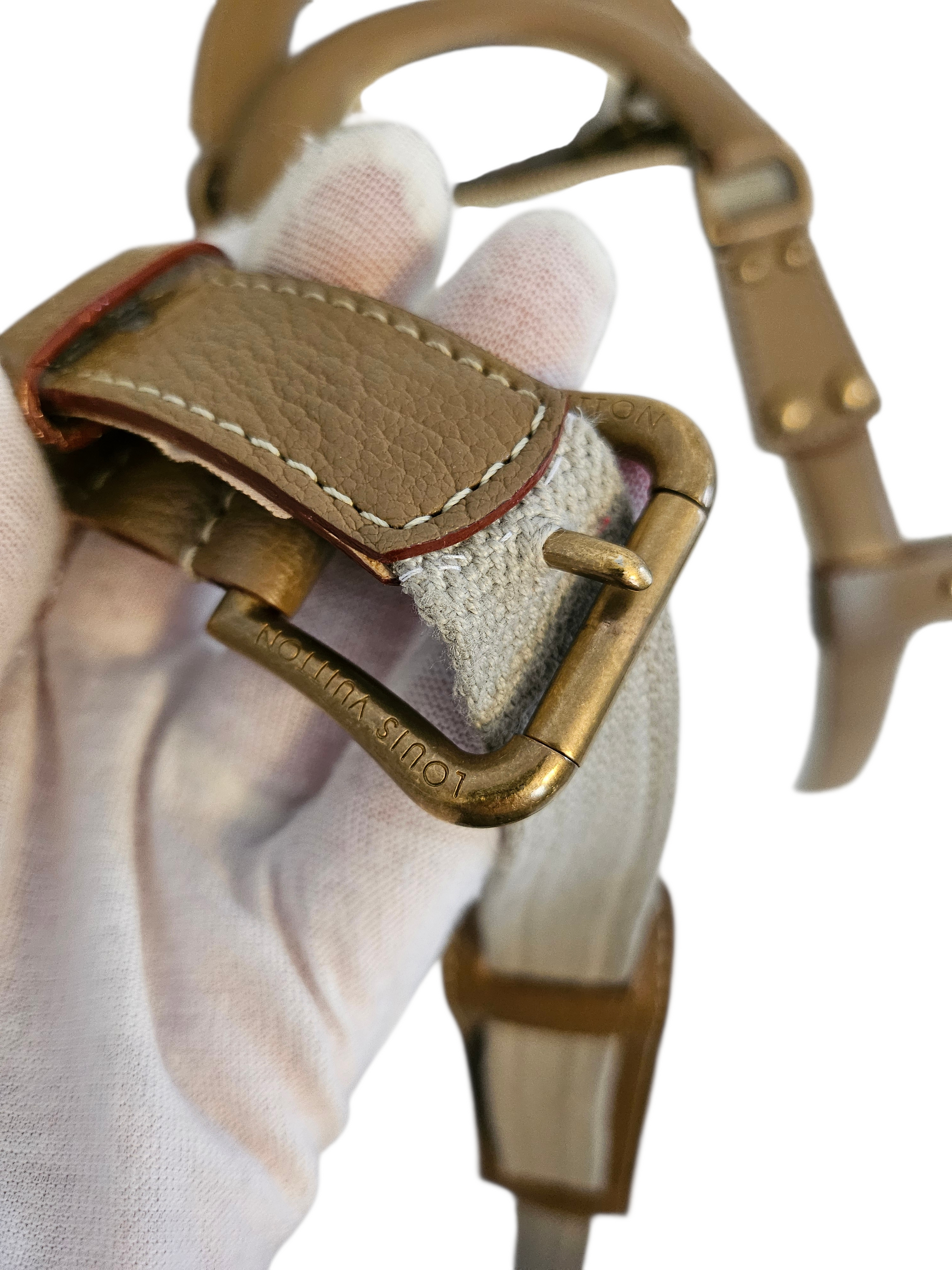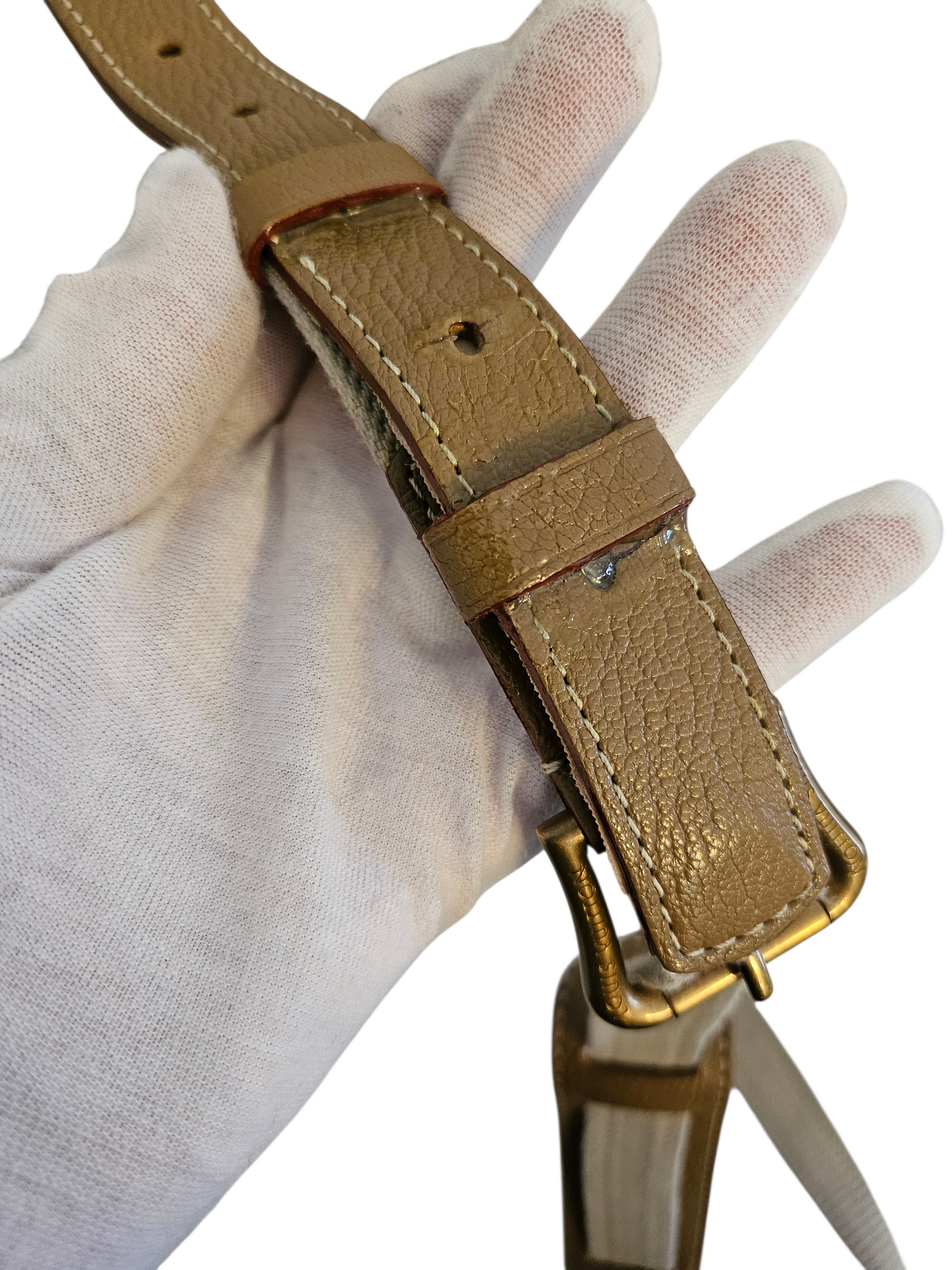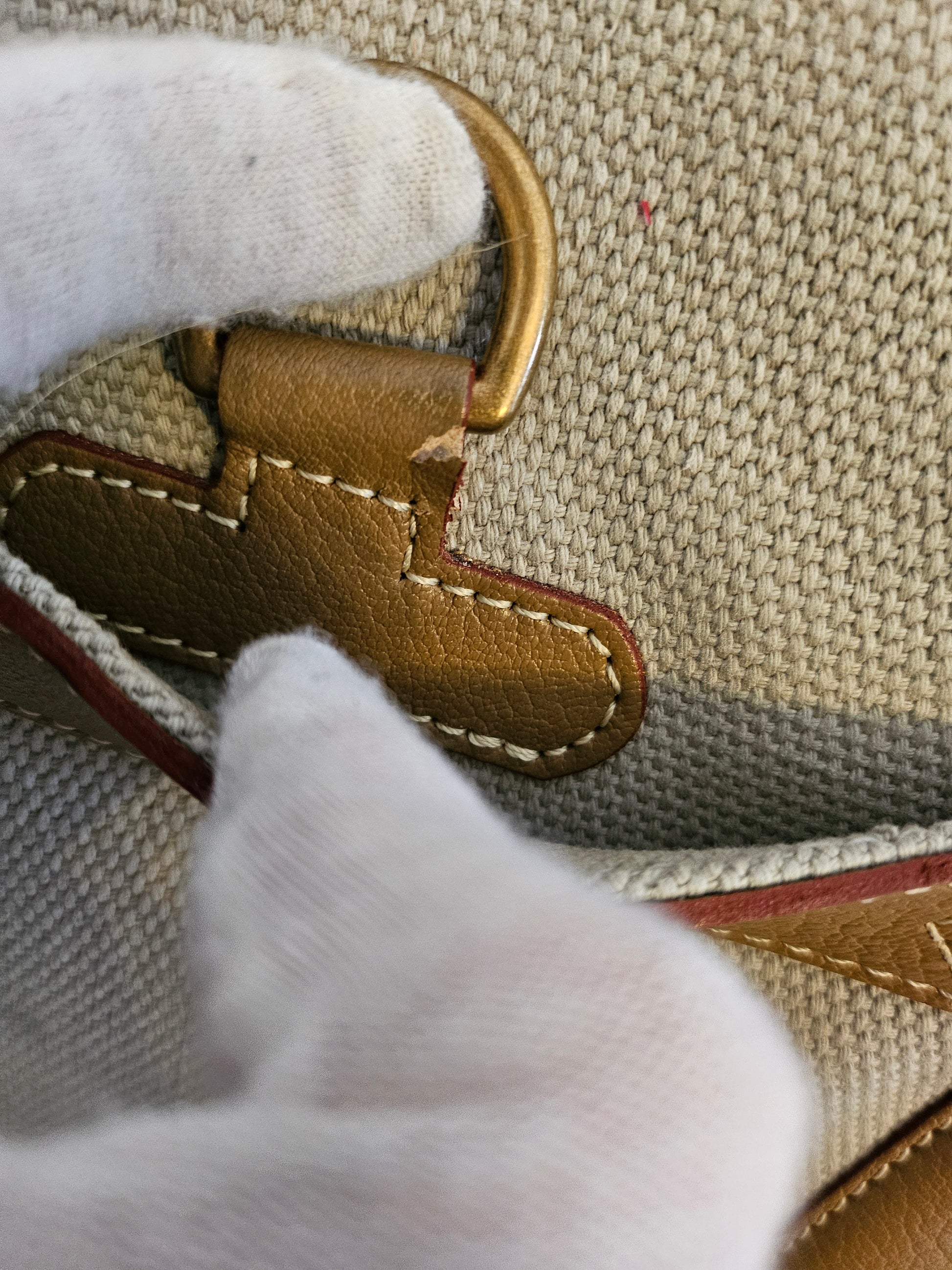 Signs of use: Signs of usage and dirt over the canvas. Signs of usage inside and on the zipper's fabric. Strap holders show some wear but not broken yet. Strap was torn and glued, extra hole is made. Leather tag from zipper's pull is torn.