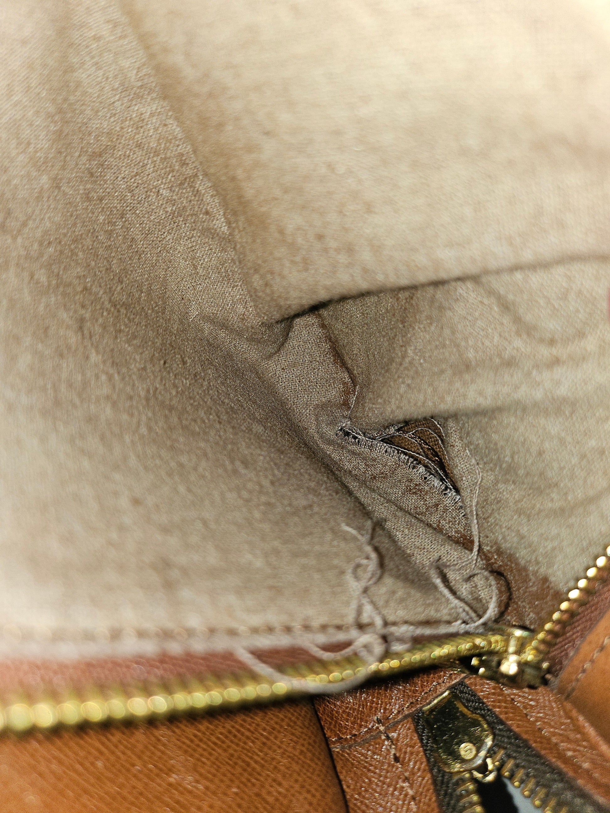 Signs of use: Leather has darkened and shows signs of usage. Discoloration and oxidation on metal parts. Signs of usage inside (scratches). Surface of both pockets is removed. Inside pocket is torn.
